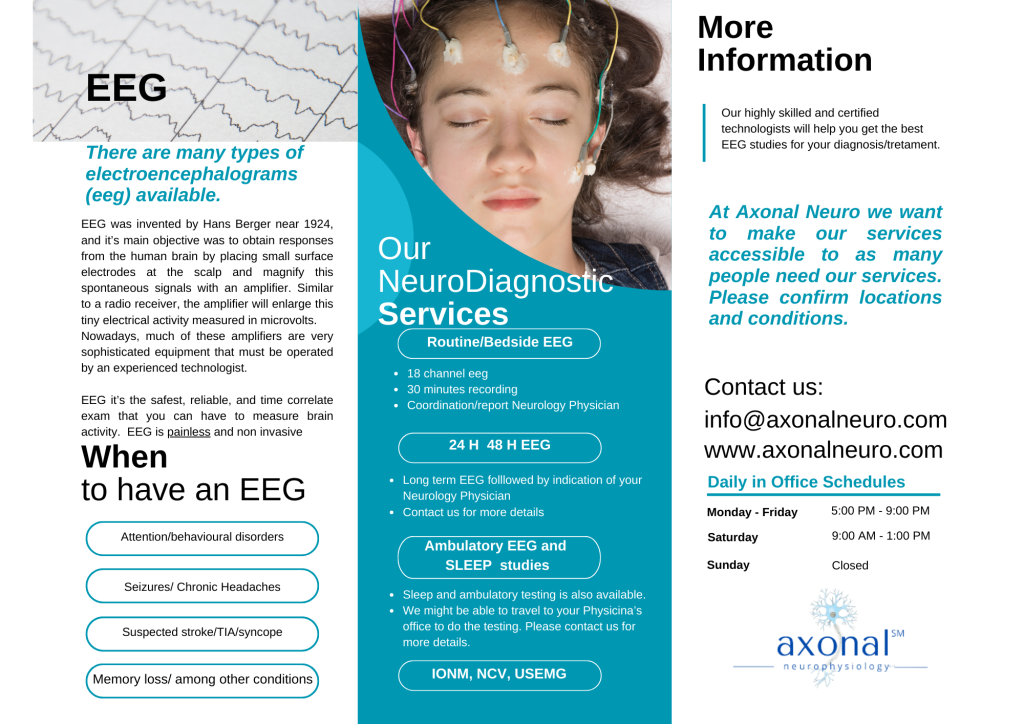 History: Axonal Neurophysiology 9-12 was conceptualized in 1995 by a prestigious Neurologist and Neurophysiologist who’s mission was to promote innovation and availability of the service to many geographical areas. The demand for equipment and technologists availability to perform specialized services was increasing. The number of technologists and Educational Programmes were very scarce, situation that is not different than today. Nowadays, the organization is trying to increase it’s level of accessibility by investing in professional development, skills, and high end technology that allows doing the same testing done 30 years ago in a matter of minutes, without sacrificing quality. As a commitment to quality, our associates and personnel are constantly training, developing innovation, and are active members of various neurophysiological and neurodiagnostic associations all over the world. We invite you to be part of our company and help improve the quality of life of patients and families.